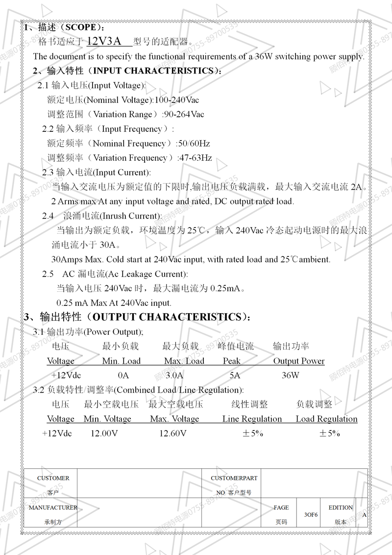 12V1.25A電源適配器規(guī)格書(桌面式)
