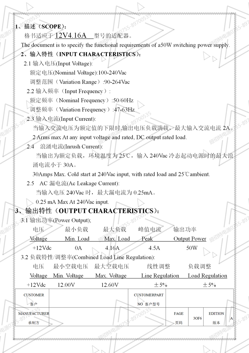 12V1.25A電源適配器規(guī)格書(桌面式)